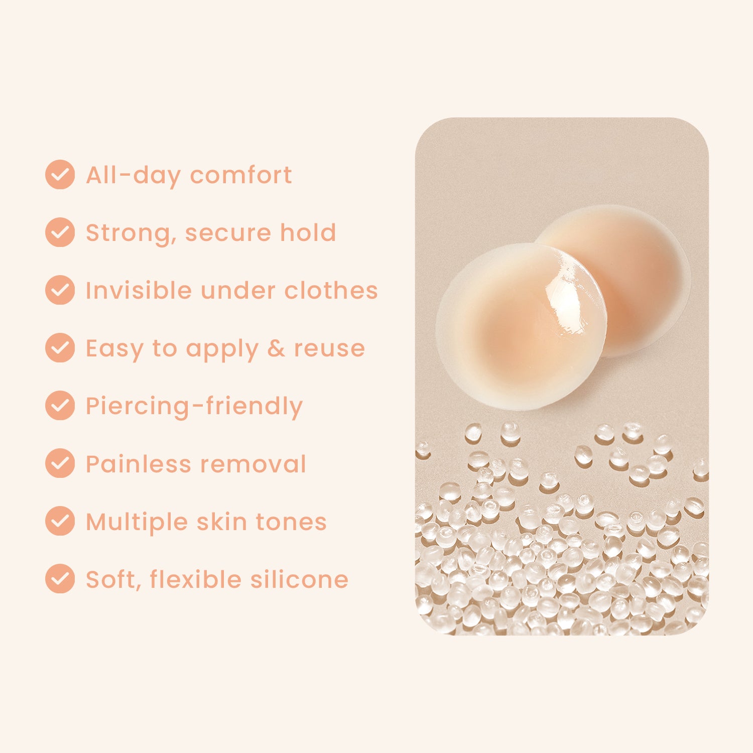 Made with a gentle, reusable adhesive, Grippy Cakes stick securely and peel off easily without any irritation. They’re skin-safe, breathable, and lightweight, so you can wear them all day and forget they’re even there.
